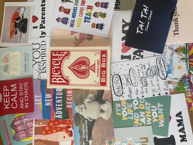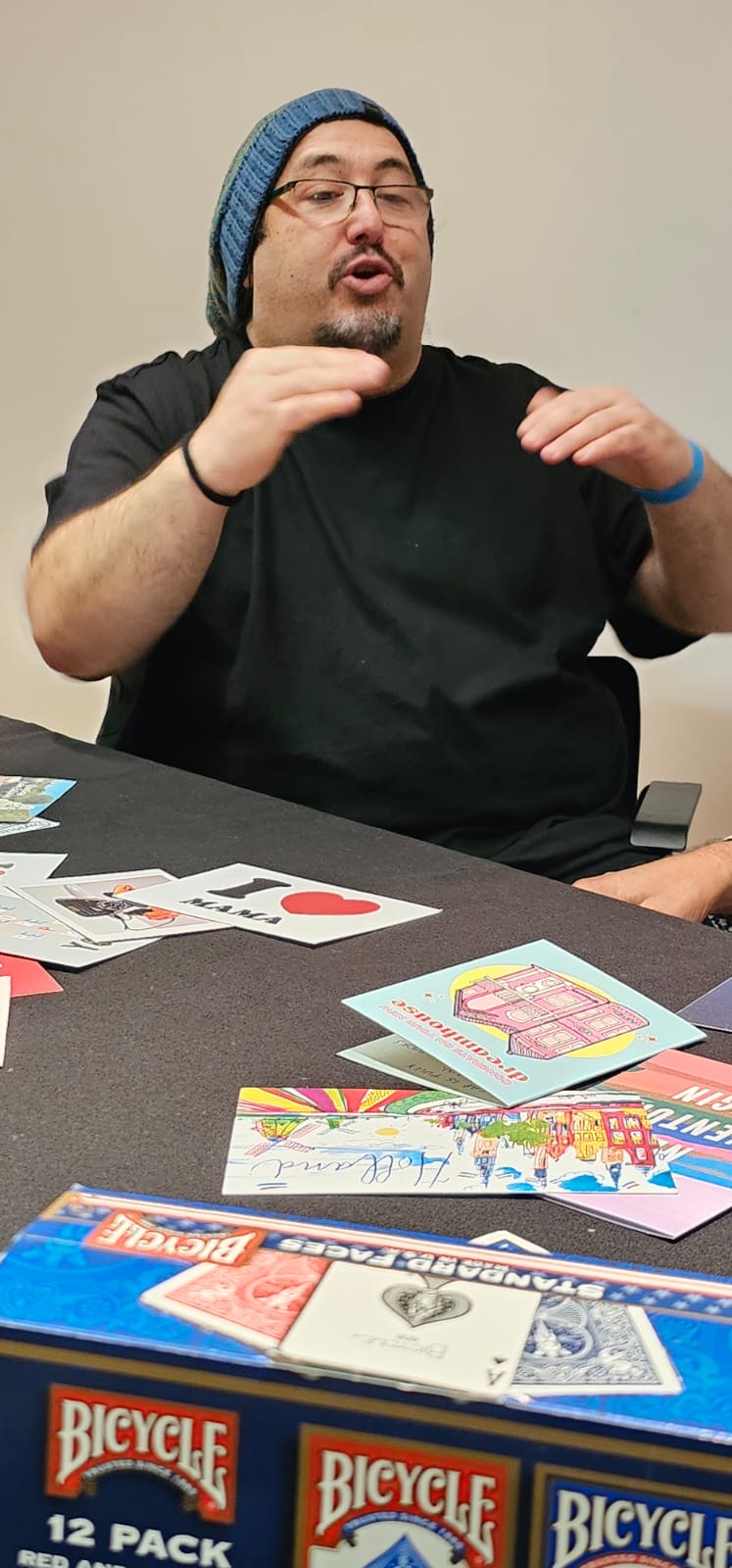 Ik overhandig Dani een Bicycle jumbo deck maar met ansichtkaarten van afbeeldingen en quotes. Dat verrast hem. Ik leg uit dat op de achterkant de vragen staan. Ik schud de kaarten op tafel maar Dani corrigeert mij. Op zijn bekende manier “roffelt” hij op de tafel met zijn handen en doe ik met hem mee. “Dat geeft extra energie” vult hij aan. Dani begint er erg om te lachen en pakt een stapel kaarten. “I shuffle, I shuffle, I shuffle” zingt hij. “Het ziet eruit als de Lennart Green shuffle” voegt hij toe. Dani pakt de eerste ansichtkaart.