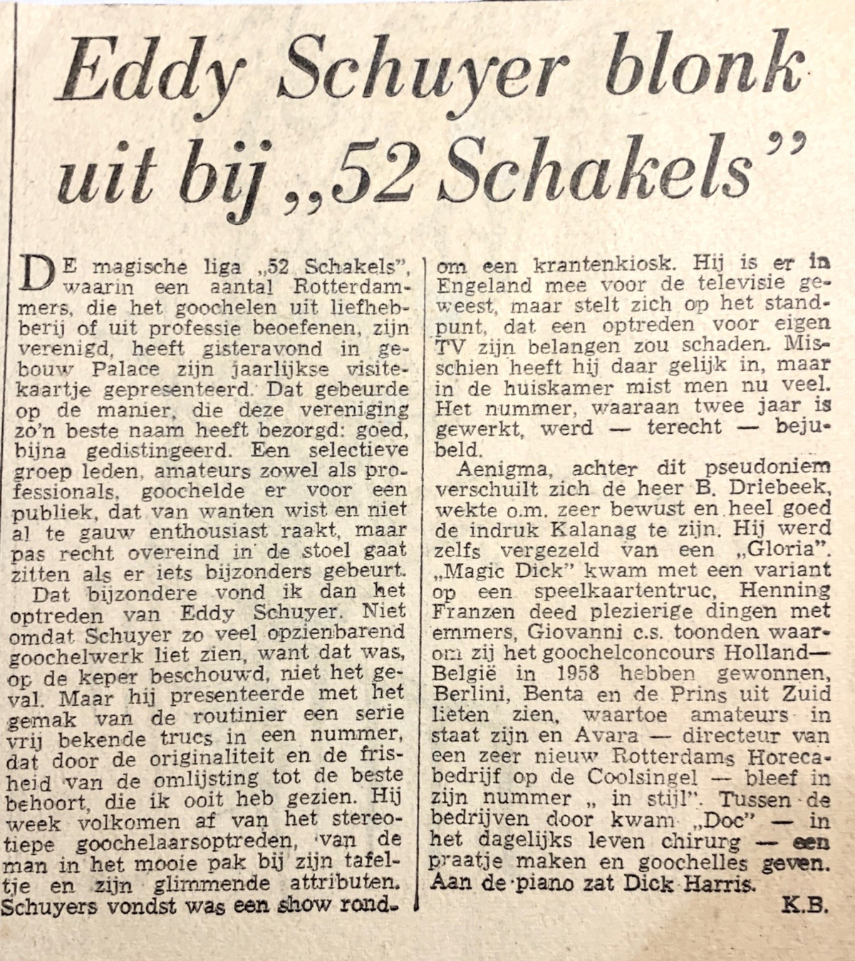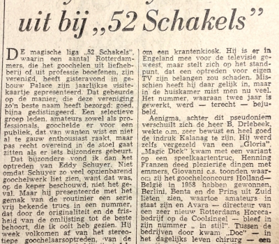 In 1953 deed hij mee aan het NMU congres in Rotterdam. Hij had het tempo wat vertraagd en daardoor konden de toeschouwers wat meer genieten van zijn uitgebalanceerde nummer met vele goede vondsten en won hij de tweede prijs algemeen goochelen.