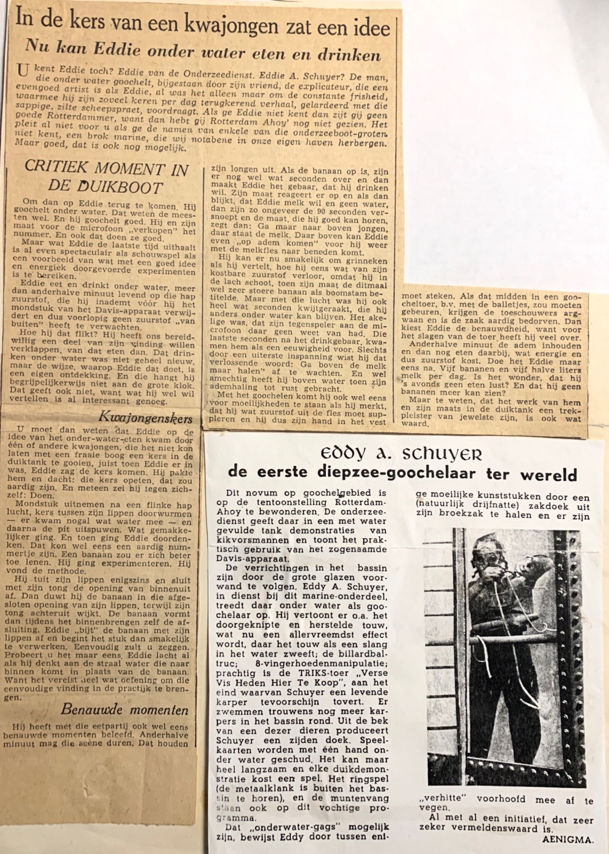 Eddy heeft lange tijd bij de Koninklijke Marine gezeten en vertoonde dan aan zijn dienstmaten zijn goocheltrucs. Dat was een prima leerschool, want als het niet goed ging, lieten ze dat direct merken. Hij maakte ook de tweede wereldoorlog mee en zat in 1945 als krijgsgevangene in Duitsland. Dat was een afschuwelijke periode. Maar hij bleef steeds oefenen met goochelen. Terug in Nederland kwam hij weer bij de marine. Maar goochelen was ook zijn lust en leven. En in 1952 trok hij zijn uniform uit en werd beroepsgoochelaar. En dat is hij zijn hele verdere leven gebleven.