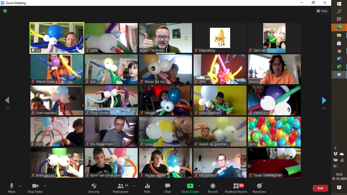 Dennis: Er waren dingen mogelijk zoals de groepjes junioren verdelen over break-out rooms, een rondleiding door het House of Magus, een interactieve vragenronde met Rob en Emiel en een ballonnen workshop van Ab Schouten. Ik had groot ontzag voor Ab, want even online helpen een knoopje leggen is dan toch wel wat lastig.