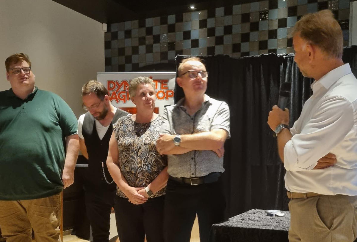 Uw president was samen met twee andere bestuursleden van het Dagelijks Bestuur ook afgereisd richting het Limburgse land. Met goede reden uiteraard. Rene Geelen verdient een grote blijk van waardering voor 25 jaar vakmanschap. Na het dealerschap van Kali heeft Rene die rol eigenlijk overgenomen. Als toonaangevend dealer, maar ook als organisator van de Dynamite Magic Day dagen én als organisator van vele lezingen door internationale goochelaars van naam. De fotogalerij in de winkel getuigt van een imposante serie goochelaars die Velden hebben aangedaan voor een mooie avond magie. Zo heeft Rene in al die jaren ervoor gezorgd dat onze community gestimuleerd en gemotiveerd en in verbinding met elkaar bleef. En dat altijd in combinatie met vakmanschap en kwaliteit. Menigeen roemt Rene Geelen om zijn goede service en waardeert zijn grote inzet voor de goochelkunst in Nederland.
