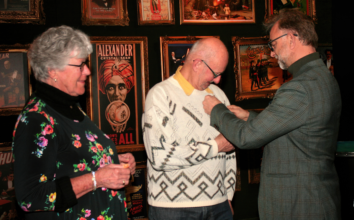 Om een NMU Gouden Speld te mogen ontvangen voor je verdiensten voor de goochelkunst wordt bepaald door een Gouden Speld Commissie na voordracht aan en goedkeuring door het Dagelijks Bestuur. Maar er is ooit ook een “pluim van de president” in het leven geroepen. Daar ben ik heel blij mee. Op persoonlijke titel ontving Richard Dreijer van Gonga deze van mij en onlangs Dick van der Zwan van Goochelclub Rotterdam.