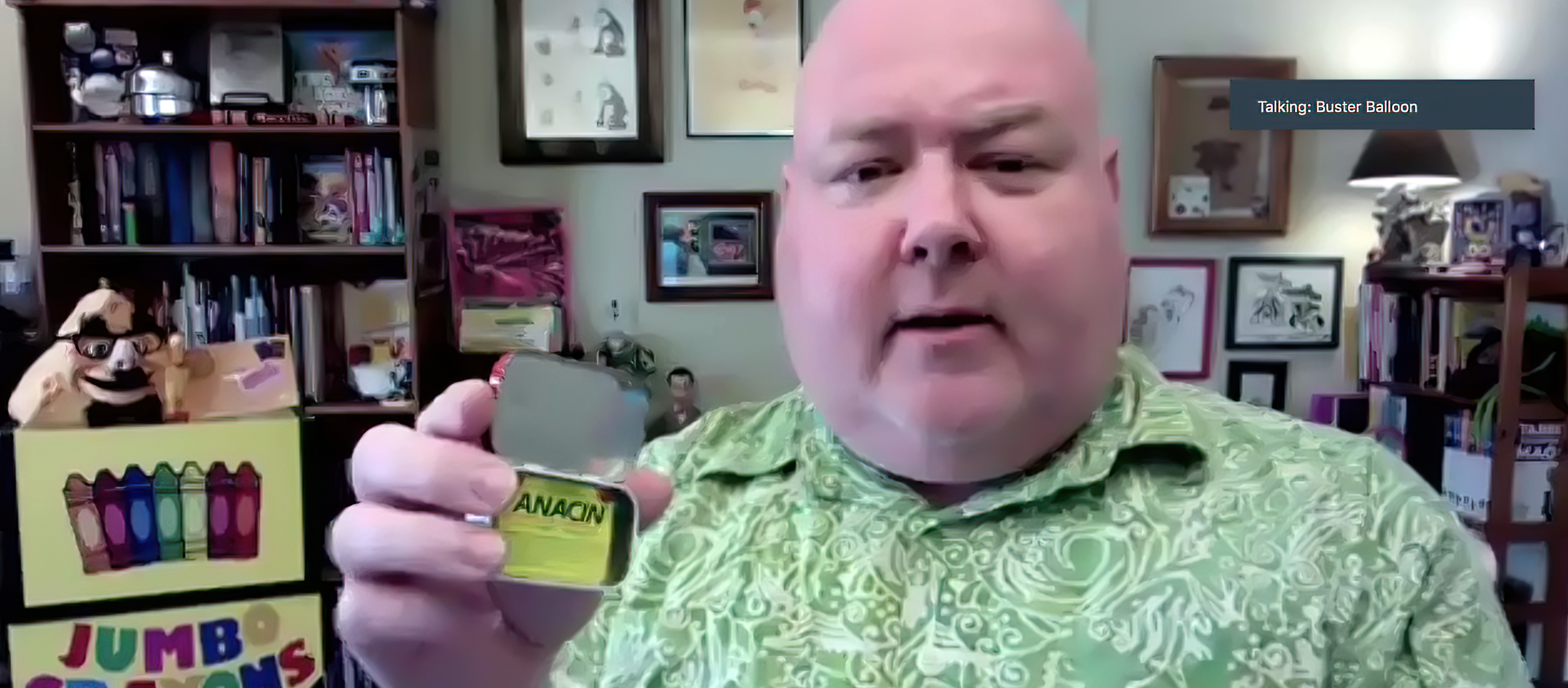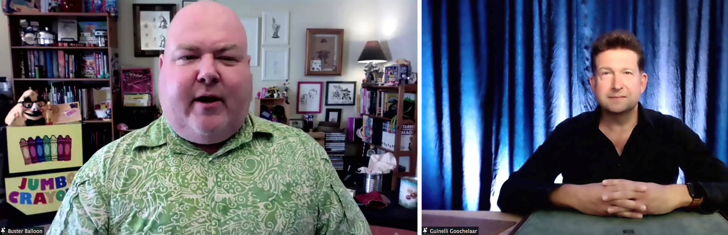 Buster is ruim twintig jaar actief als goochelaar, clown en ballonnenartiest en houdt van slapstick. “In tegenstelling tot vele collega’s hou ik juist van virtuele shows en ik denk dat die ook nog wel een tijd zullen blijven.” Buster demonstreert al snel een voorbeeld van zo’n voordeel van online werken. Hij laat een munt zien die vrij klein is, maar groot lijkt als die dicht bij de camera wordt gehouden. Een aantal keren wisselt hij deze positie; kleine munt lijkt groter te worden en dan weer kleiner, totdat hij ineens een grote munt op afstand van de camera laat zien. Een verwisseling die makkelijk kan buiten het oog van de camera, dus van de kijker. “Dit geeft een unieke kans om het jezelf makkelijker te maken voor verschijningen, verdwijningen en dergelijke. Je hebt geen ‘pocket management’ nodig”, aldus Buster.