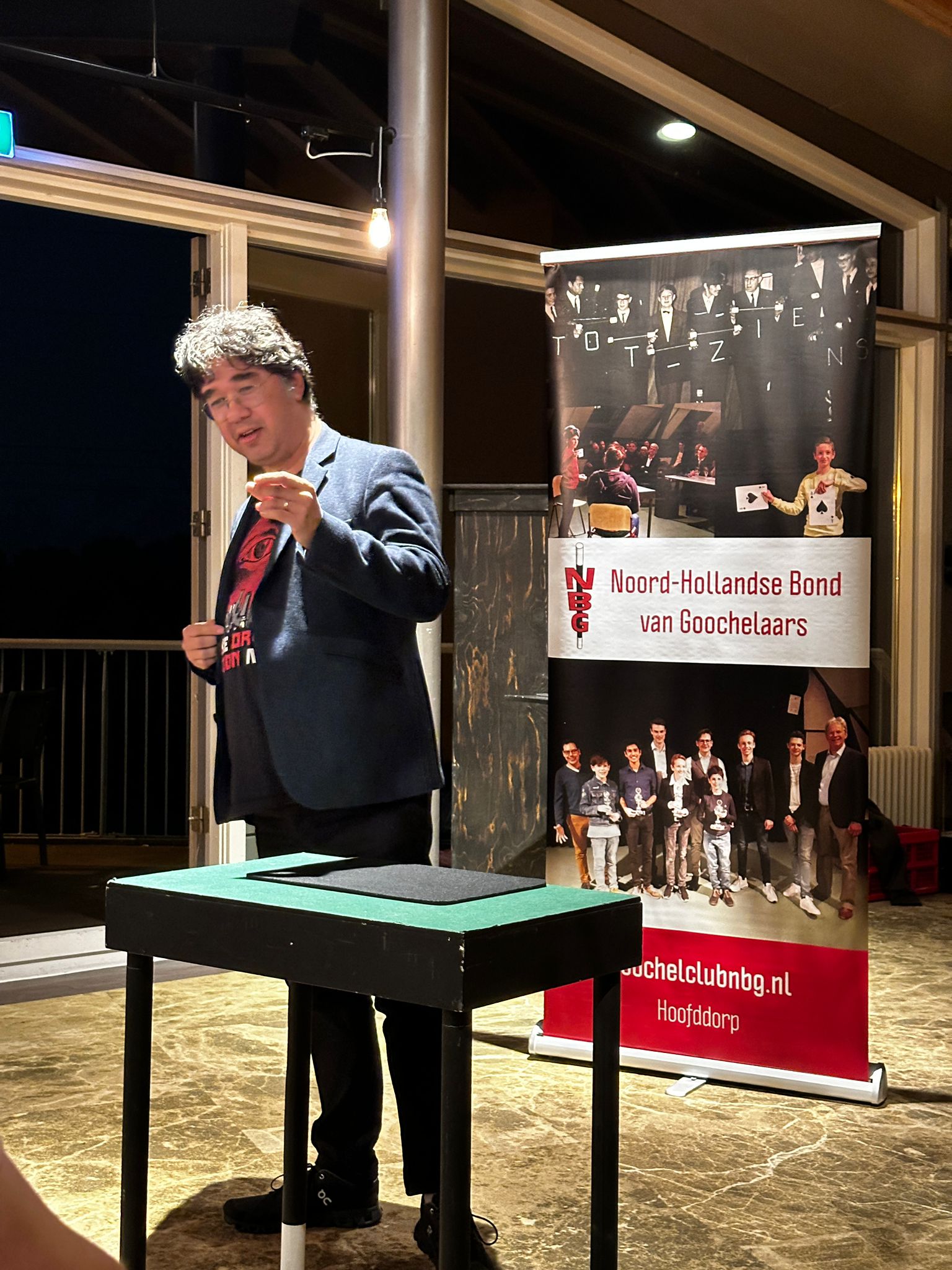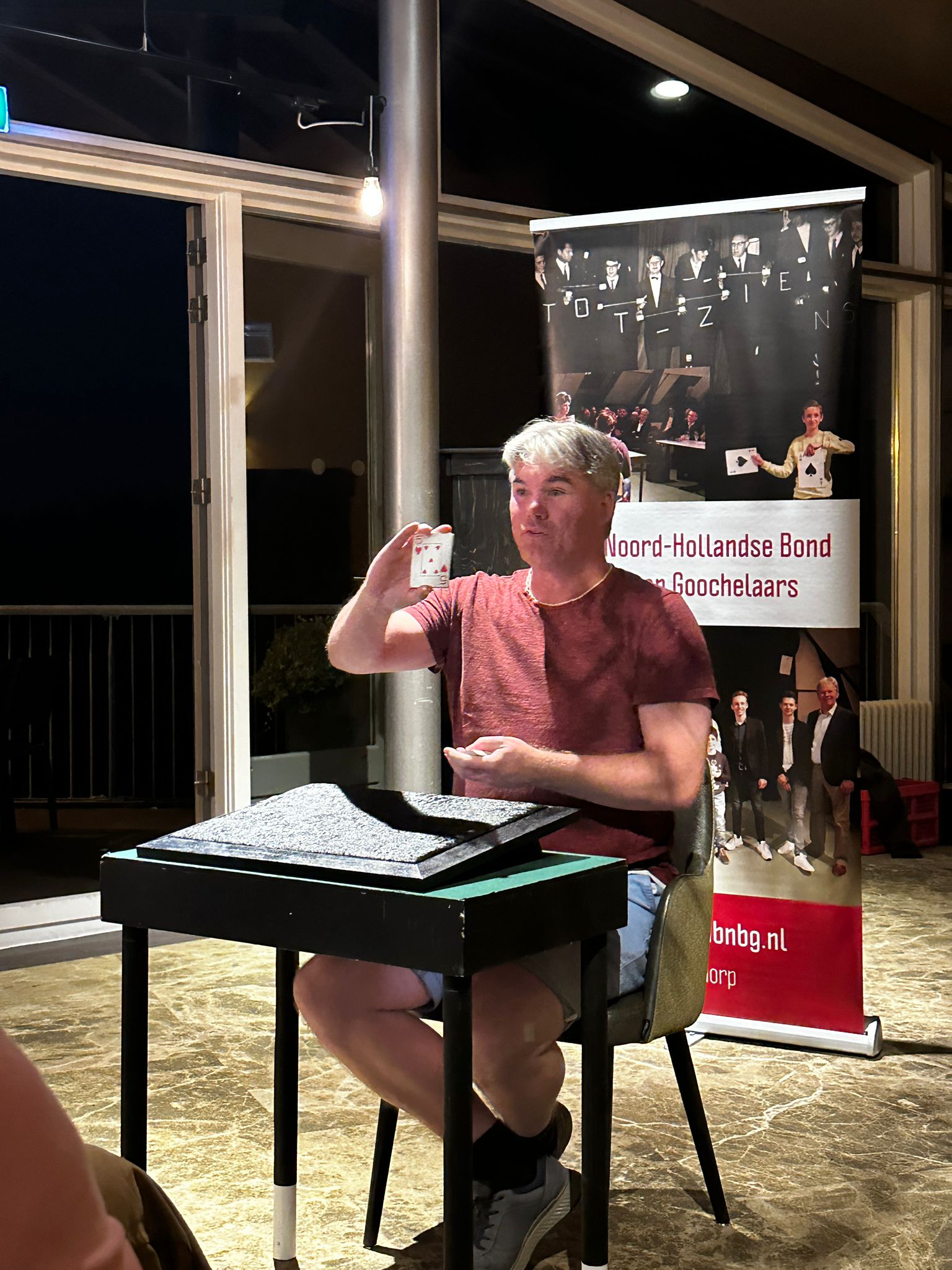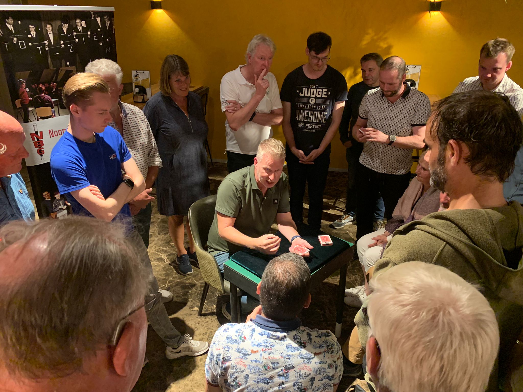 Na een inspannende middag kwam iedereen uiteindelijk weer bij het clubhuis aan en meteen kwamen de kaarten, munten en andere trucs weer tevoorschijn en dan moest de avond nog beginnen! Na het diner van de golfende goochelaars kwamen ook de andere leden van de Noord- Hollandse Bond van Goochelaars (NBG) naar Heemskerk om daar onze maandelijkse clubavond te houden en dat werd een feest!