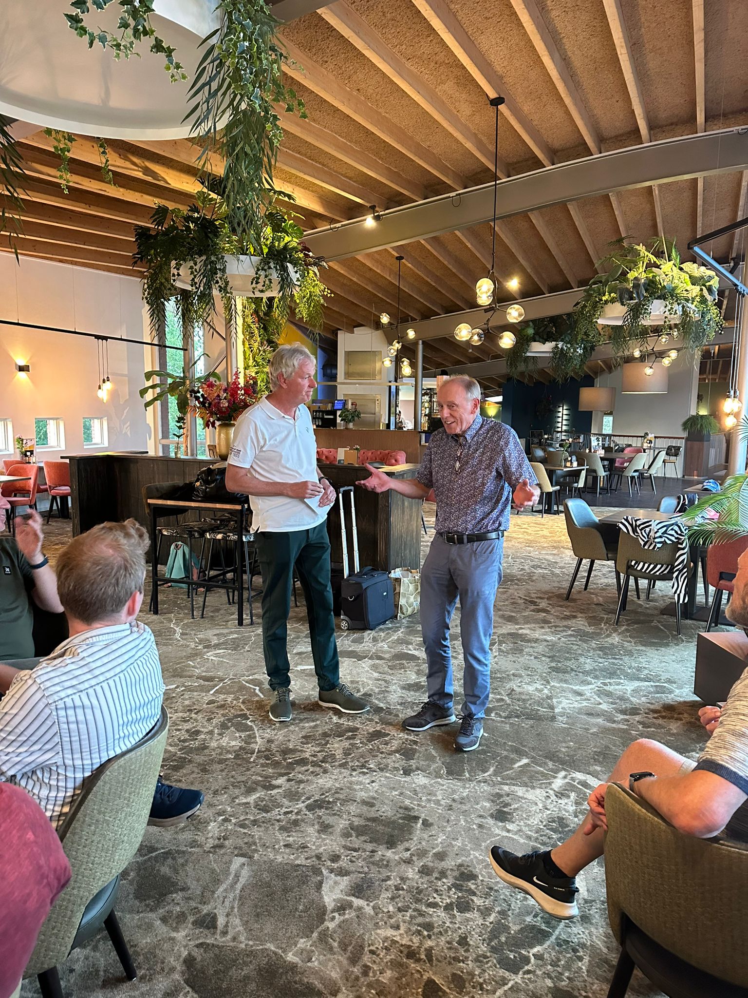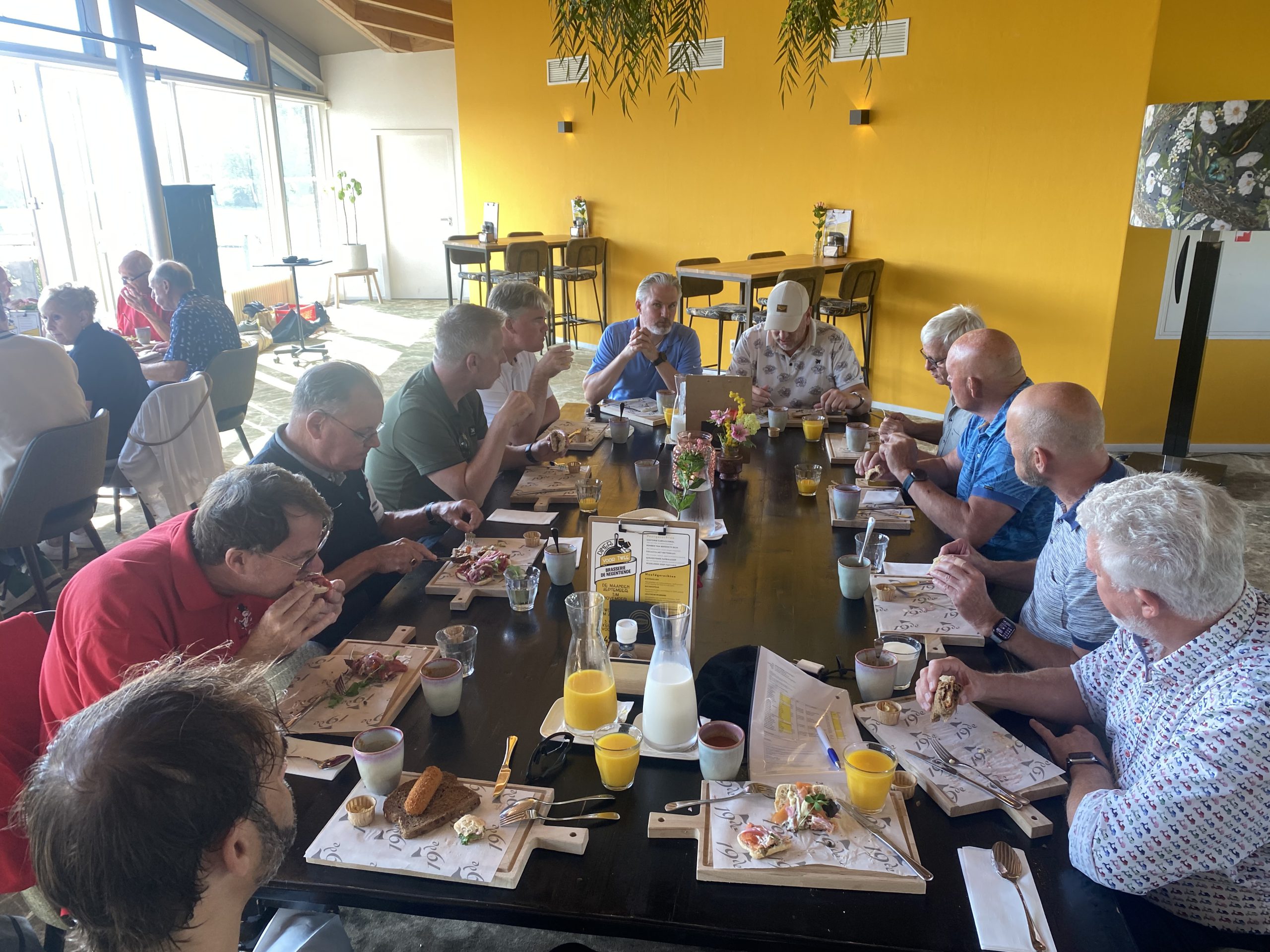 Het was direct al een feestje en de stemming zat er goed in. Rond 12.00 uur was er een uitgebreide lunch in het clubhuis van de Heemskerkse Golfclub en werden de flights (met wie loop je de ronde?) ingedeeld. De golfspanning steeg en de topgolfers Lodewijk de Widt, Peter Woerde en Henk Oud sloegen hun eerste ballen weg om 13.00 uur.