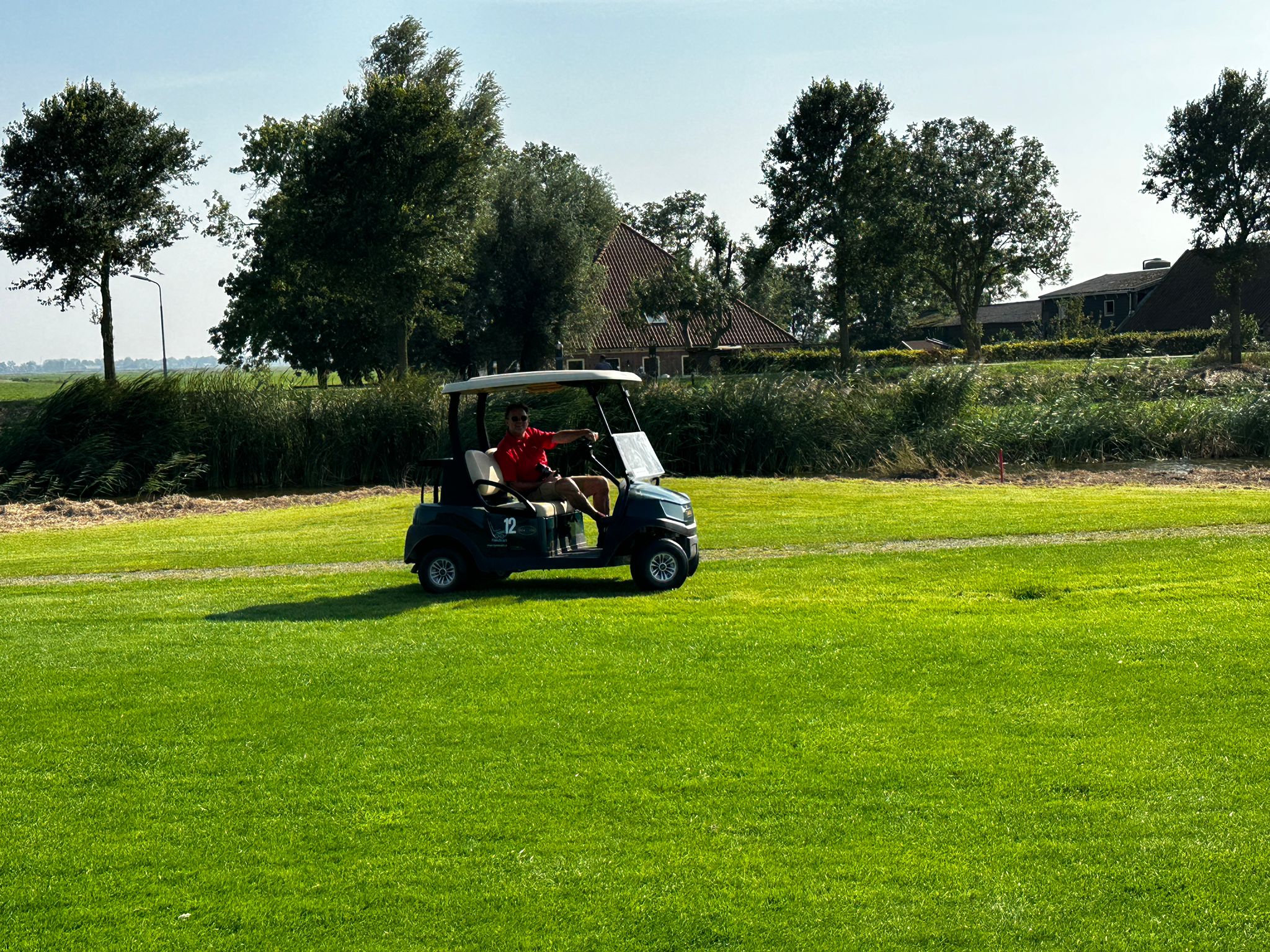 Intussen was iedereen nu op de baan en Peter Vogel (die door een blessure helaas niet mee kon golfen) peilde de stemming en reed met de buggy door de baan voor de mooiste fotomomenten.