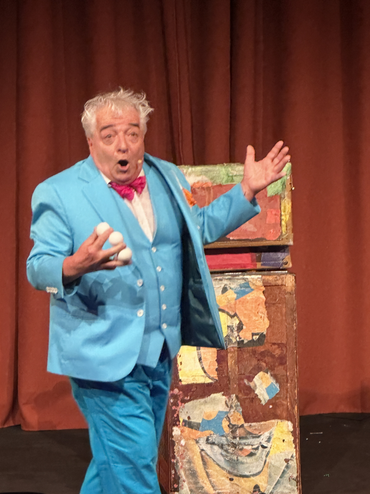 Martin Hansson’s act (Zweden) die ik een paar jaar geleden heb gezien in Ede was weer verbeterd. De wijzerplaat van een zakhorloge veranderende in een sponsbal/neus. Zo ook een roos. Om op het einde weer terug te veranderen. Alles met drama gebracht met lastig te beschrijven moderne muziek en dat bedoel ik positief.
