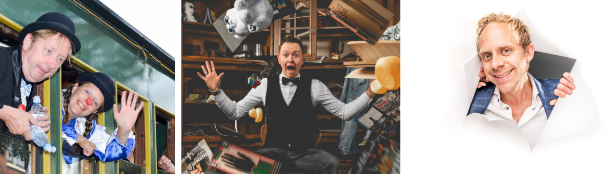 Jori Veldhuizen (NL), Marc van Damme (Marco Fiasco) (BE) en Quintus van Amstel (Quintus de paarse goochelaar) (NL)