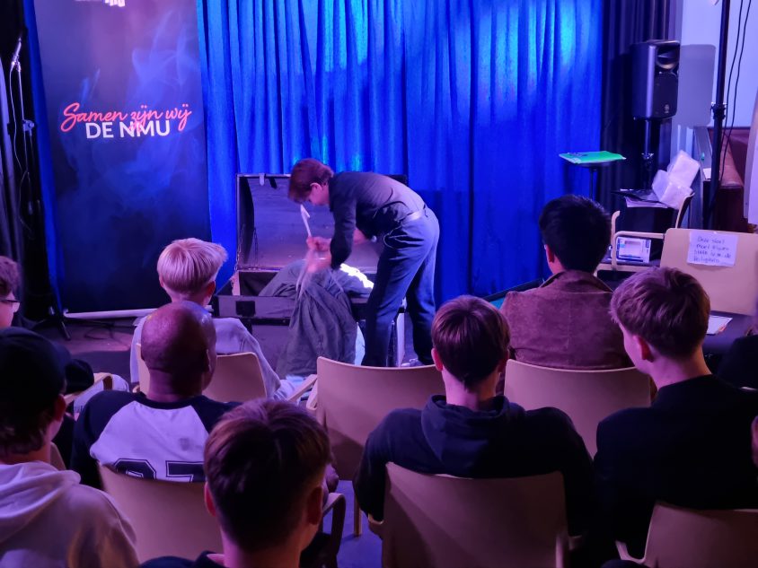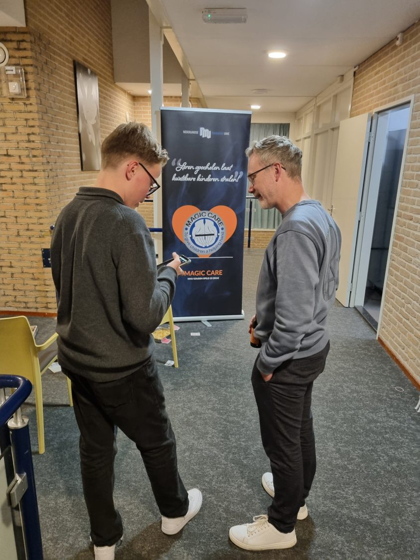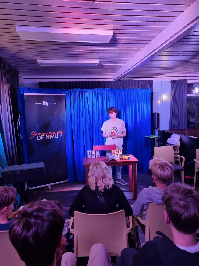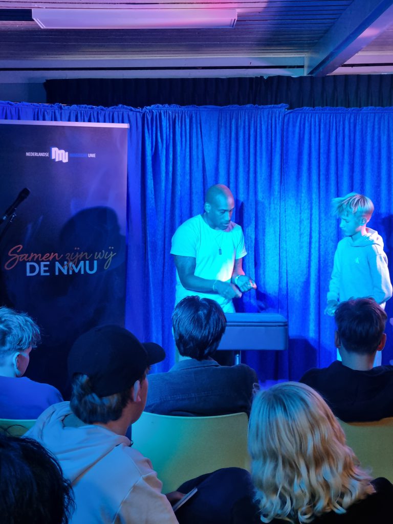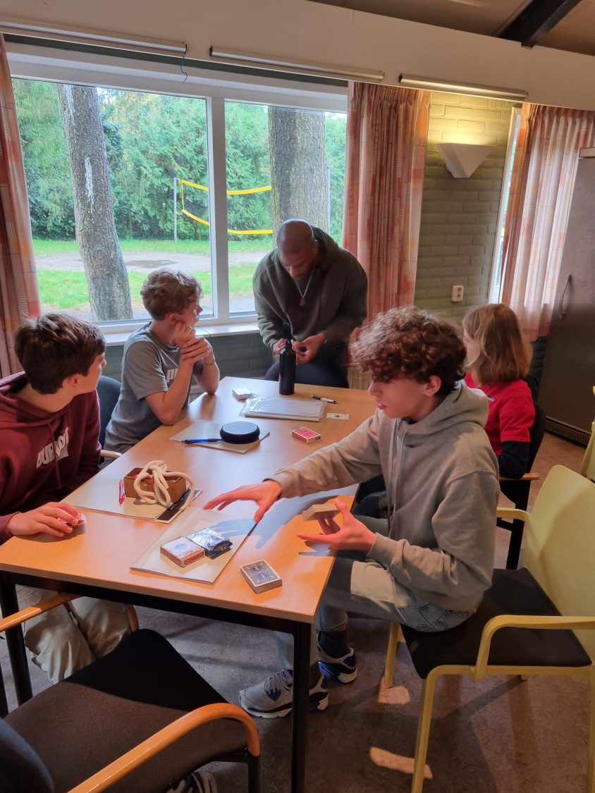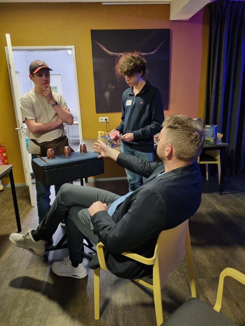 Aansluitend werkten de deelnemers onder leiding van Woedy Woet en Hilbert aan hun eigen trucs. Diverse deelnemers lieten hun acts zien en kregen direct feedback. Dit is altijd een prachtig onderdeel van het weekend, omdat iedereen niet alleen leert van zijn eigen optreden, maar ook van het meekijken bij anderen. Woedy en Hilbert voelen zich als vissen in het water op zo’n jeugdweekend. Hun praktijkervaring, kennis en kunde maakt de feedback bijzonder waardevol.