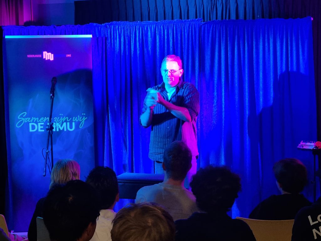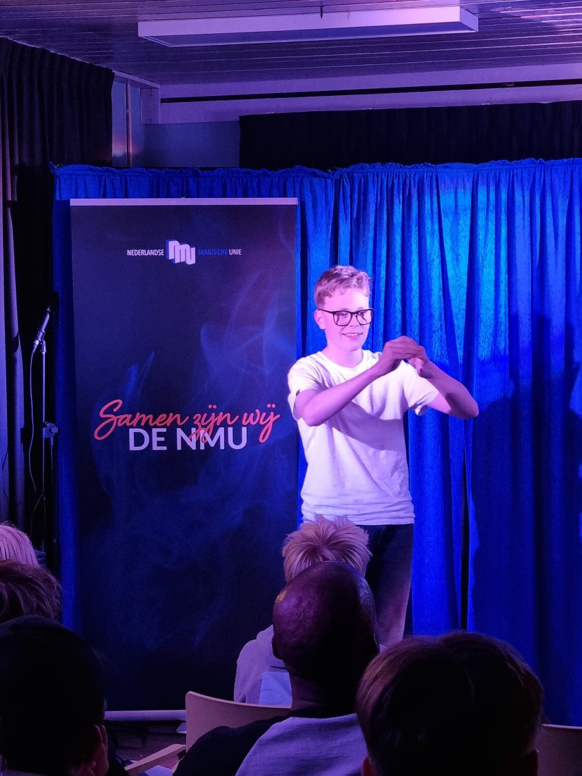 Daarna stond de masterclass van Hilbert Geerling op het programma – en dat was geweldig! Hilbert vertelde over presentatie en liet zien wat het verschil is tussen een truc presenteren zoals iedere goochelaar dat doet, of er juist je eigen draai aan geven om het interessanter te maken. We zagen een sponsbalroutine waarin steeds hetzelfde effect werd herhaald, een sponsbal verdwijnt in de hand van de goochelaar en verschijnt in de hand van de toeschouwer, en toch is het hilarisch! Hoe dat kwam? PRESENTATIE!