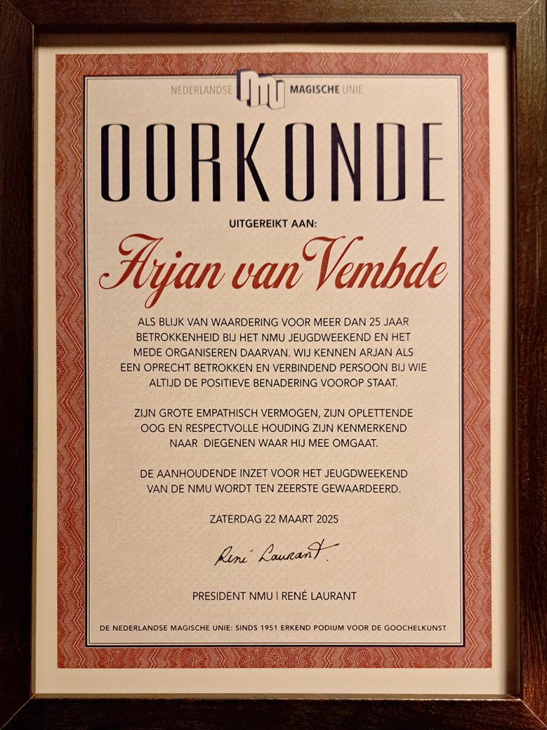 Op de Algemeen Bestuur vergadering van de NMU op 22 maart werd door President René Laurant een oorkonde uitgereikt aan Arjan van Vembde. Een grote verrassing voor Arjan die net de vergadering aan de hand van een promofilm van het NMU Jeugdweekend daar meer over vertelde. Sinds 1998 is Arjan hieraan verbonden. Eerst als deelnemer en later als grote motor achter dit jaarlijks terugkerende weekend. Voor veel jeugdleden is het jeugdweekend de springplank geweest voor een mooie carriére in de goochelkunst. Voor anderen om hun passie nog meer te ontdekken en als hobby door te zetten.