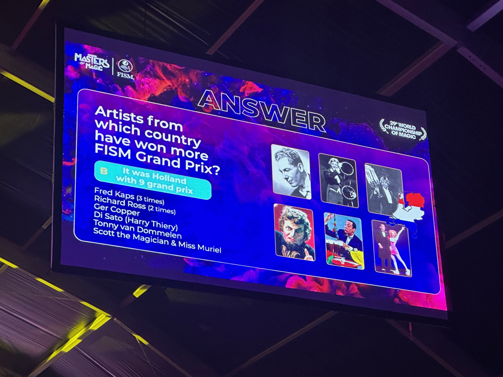 Om de tijd van de changementen te vullen werden er quizvragen vertoond over de goochelgeschiedenis. Een aardig idee maar het voegde niet heel veel toe. Wie de uiteindelijke ‘winnaar’ was bleef onbekend. Daarnaast werd er een ‘public scoring system’ vertoond. Het publiek kon zelf via een QR-code zijn scores inleveren pas nadat de jury leden zelf hun scores hadden ingeleverd. In de praktijk bleek de uitslag veelal te bestaan uit 50 of 75 punten met uitzondering voor de echte klappers die vaak iets boven de 75 scoorden en later ook veelal tot de prijswinnaars zouden behoren. De 4 acts met een uiteindelijke score BFL (Below FISM Level) scoorden ook allemaal 50 punten (!?).