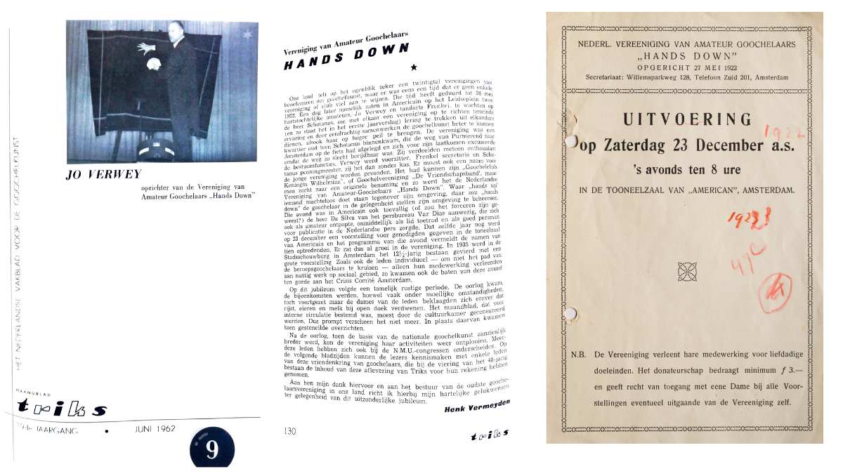 Het waren destijds een “industrieel” dhr. Jo Verwey, een tandarts dhr. Frenkel en een ‘particulier’ dhr. Schotanus die aan de wieg stonden van de eerste vereniging van amateur-goochelaars in Nederland.